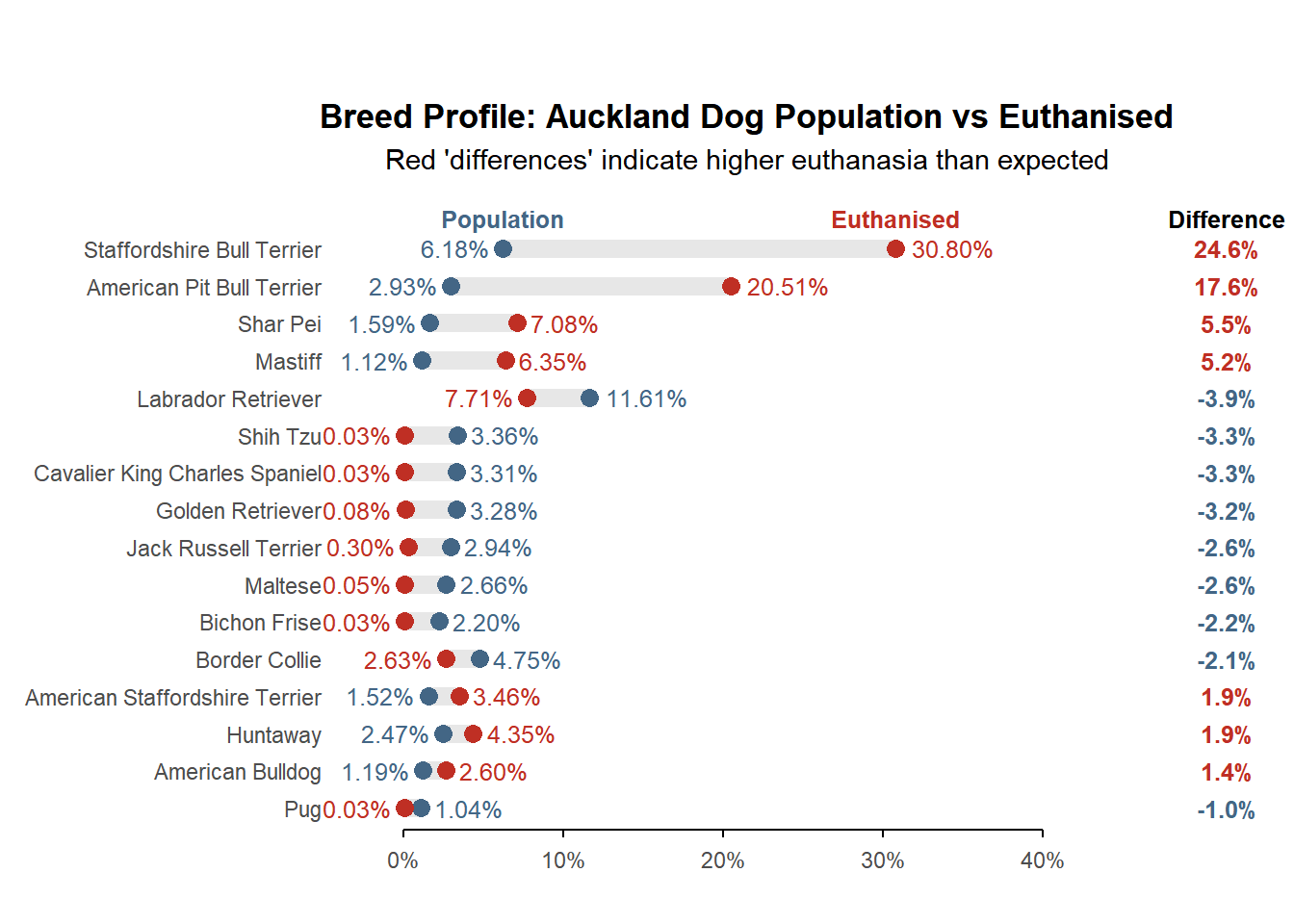 Some dog breeds were significantly over-represented in euthanised dogs compared to the overall dog population. For example, Staffordshire Bull Terriers made up just over 6% of the dog population in 2024, but accounted for just over 30% of euthanised dogs in animal shelters. On the other hand, breeds like Labrador Retrievers were under-represented, making up just over 11% of the population but accounting for under 8% of euthanised dogs.