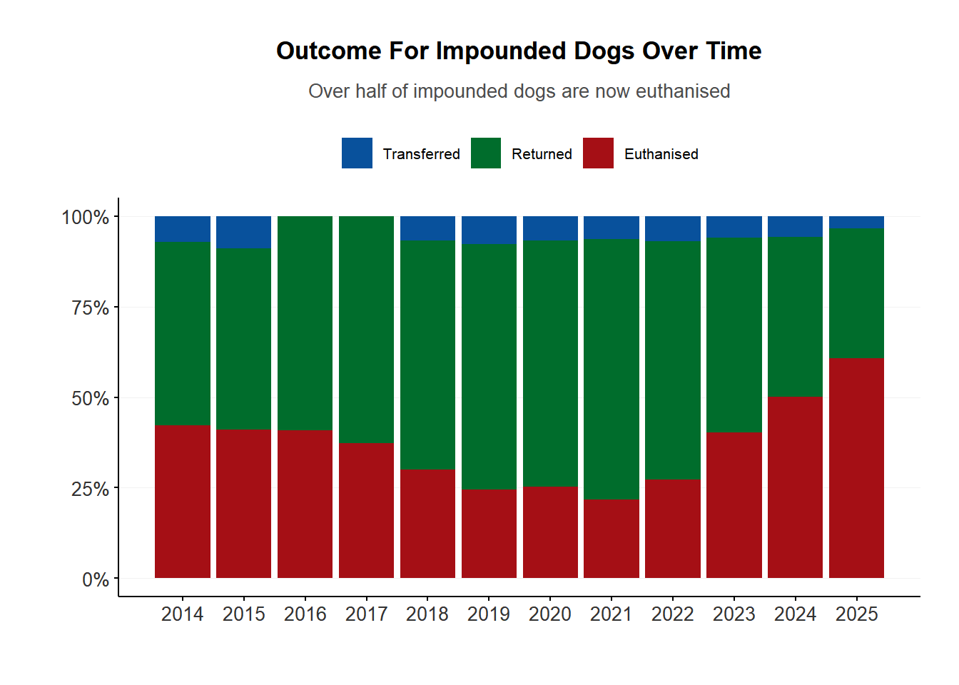 The proportion of impounded dogs that were euthanised was steadily dropping between 2014 and 2021, when it reached a low of 21.7%. However, since then it has climbed steadily to 60.8% in 2025.