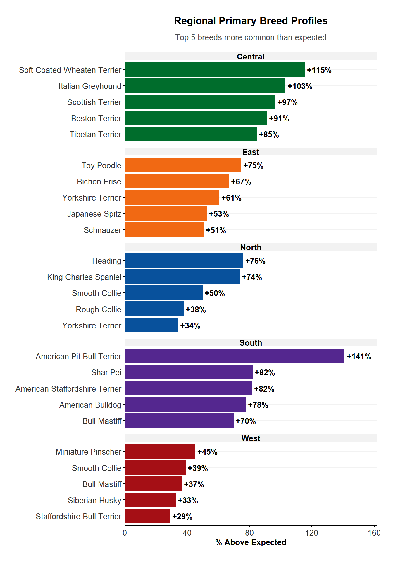 A Chi-squared test revealed which dog breeds were over represented in each region, providing a snapshot of each region’s unique breed profile.