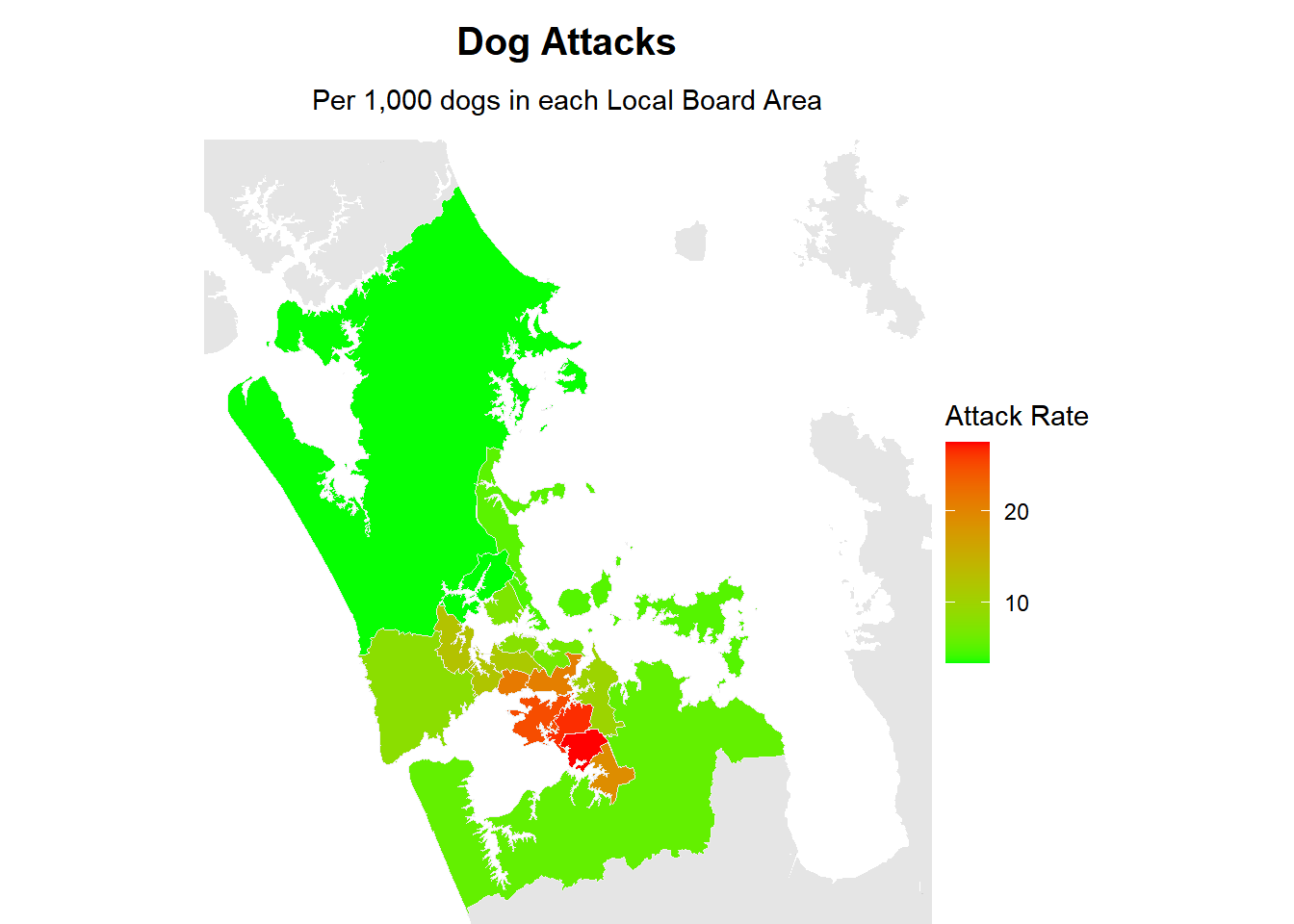 map_attacks <- auckland |>left_join(regional_data$regions_attacks |>select(local_board, rate_board) |>unique(),by =join_by(local_board)) |>select(local_board, rate_board, geometry) |>filter(!is.na(rate_board))plot_local_board(auckland, map_attacks, rate_board,"Dog Attacks","Per 1,000 dogs in each Local Board Area","Attack Rate")