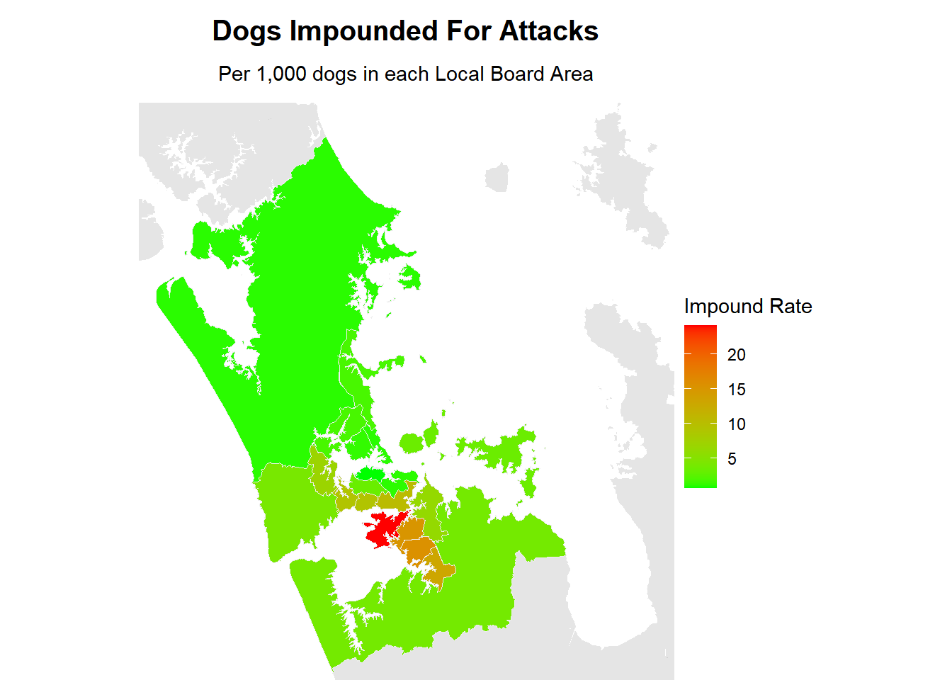 map_impounds_attacks <- auckland |>left_join(regional_data$regions_impounds_attacks, by =join_by(local_board)) |>select(local_board, rate_attack_board, geometry) |>unique() |>filter(!is.na(rate_attack_board))plot_local_board(auckland, map_impounds_attacks, rate_attack_board,"Dogs Impounded For Attacks","Per 1,000 dogs in each Local Board Area","Impound Rate")