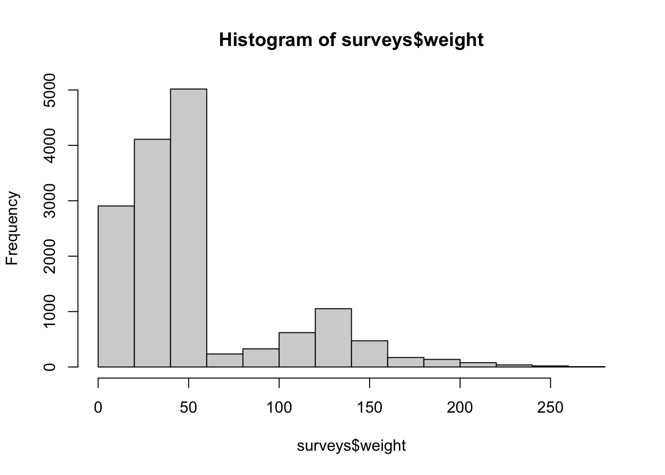 Or we could pass this column to hist() to generate a quick histogram of weights, which is useful to check the skew of the data.