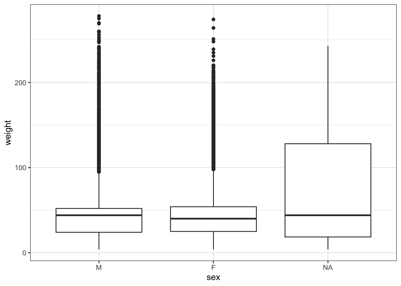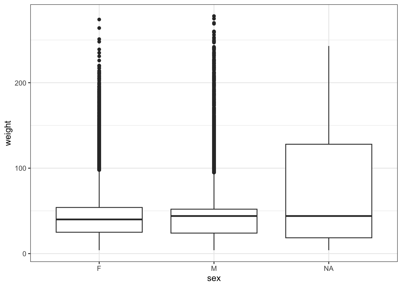 A common use of vectors is to pass them as arguments in functions. The median() function calculates the median of a a set of values. We also need to set na.rm = TRUE, since there are NA values in the weight column.