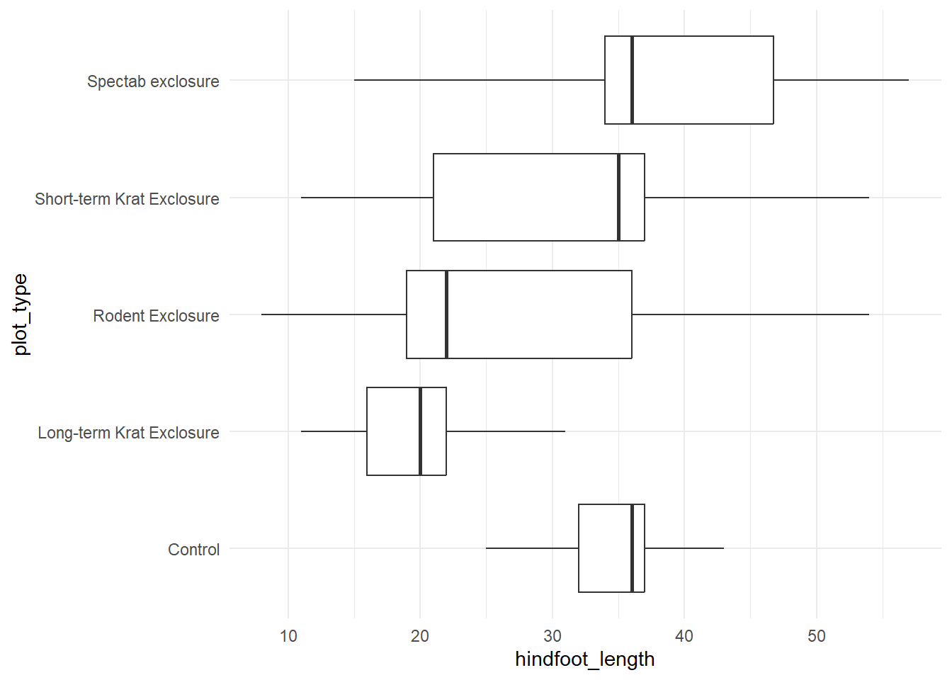 We also need to check whether the variance in hindfoot_length is roughly equal across all plot types. We can do this, again, using statistical methods, graphical methods, or both. Let’s use a boxplot.