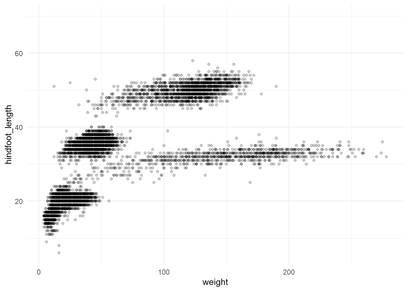 ggplot(surveys, aes(x = weight, y = hindfoot_length)) +