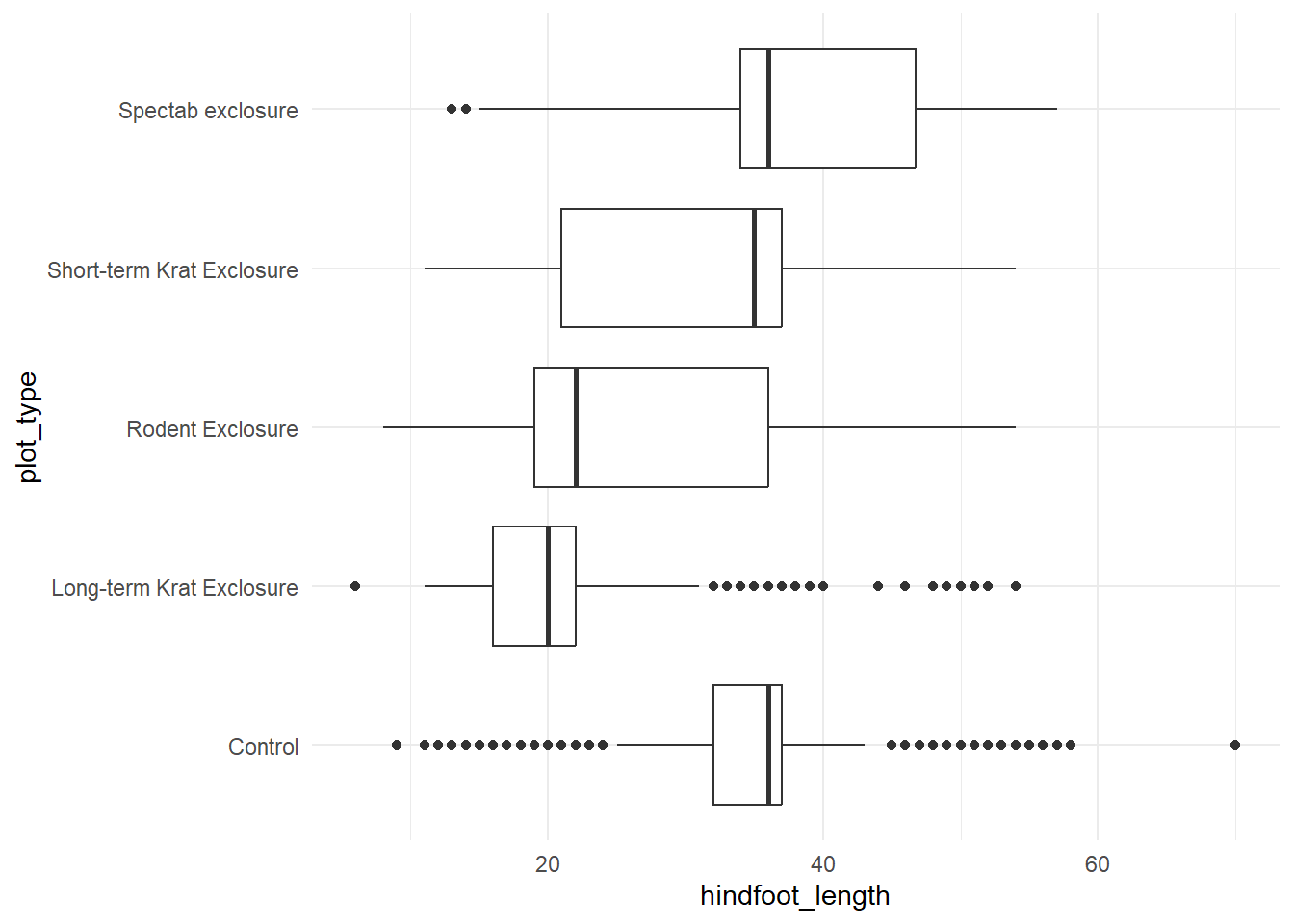 surveys, hindfoot_length ~ plot_type, pool.sd = FALSE,